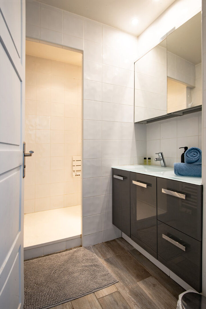 Composé d'un séjour, d'une cuisine aménagée équipée, une chambre avec VUE MER, d'une salle de douche, WC.