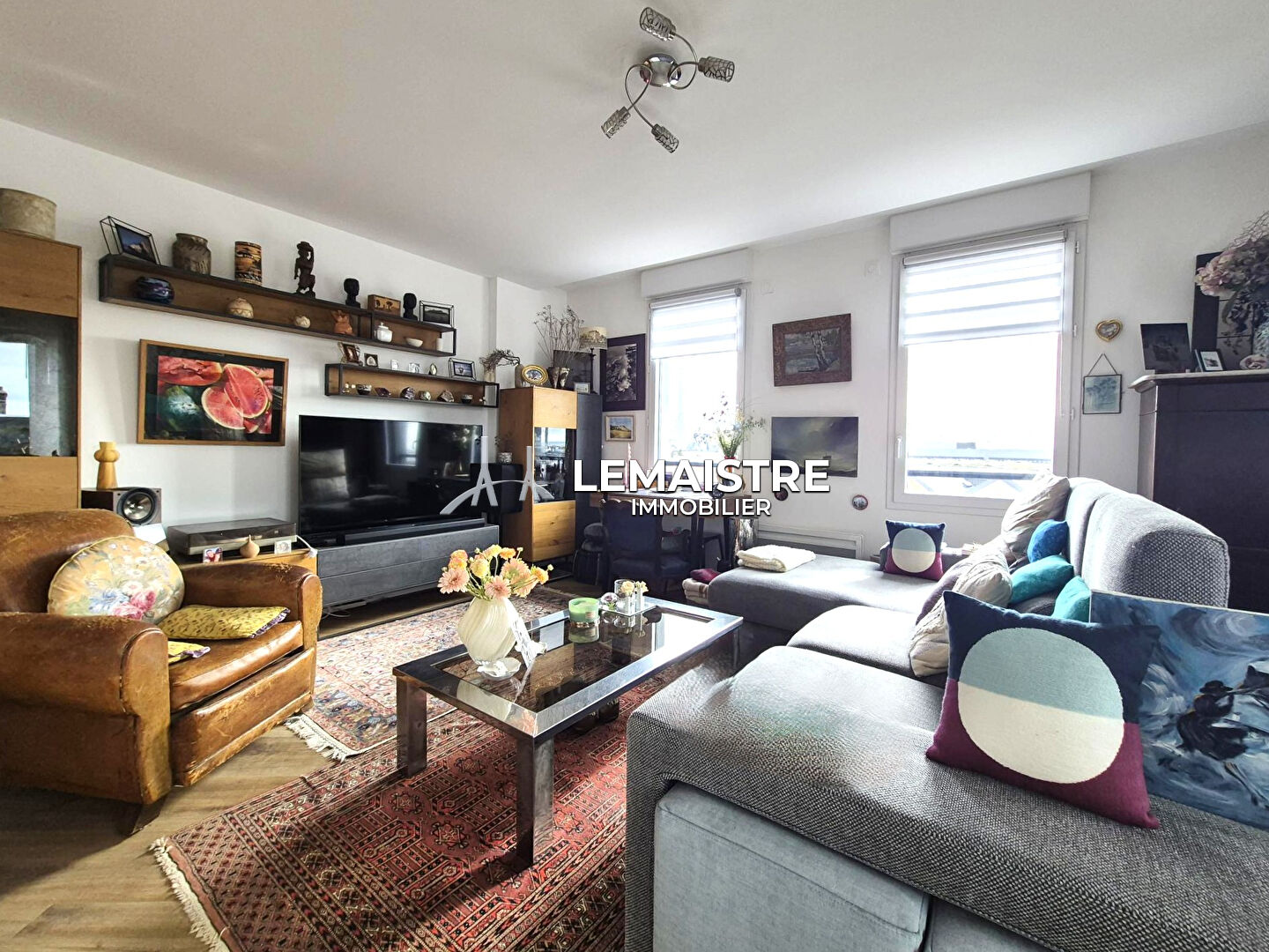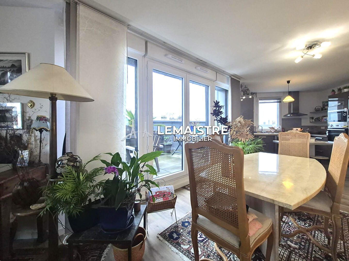 * d'un séjour lumineux avec salon et cuisine aménagée et équipée ouverte