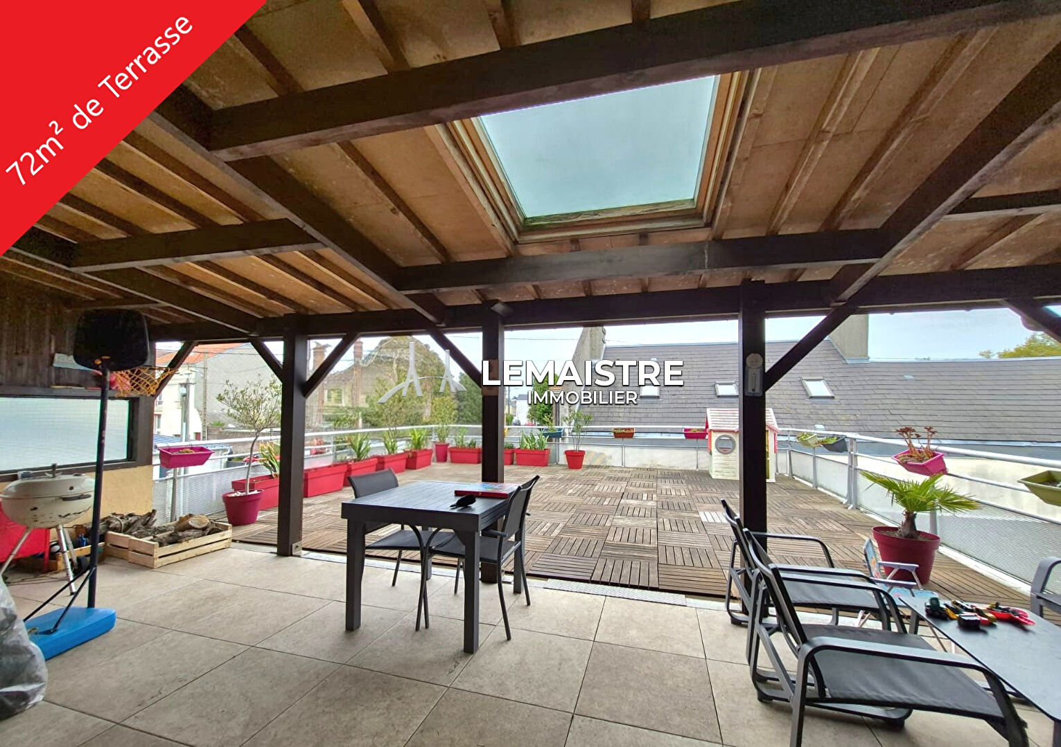 Le vrai plus : une superbe terrasse de 72 m², plein sud, parfaite pour vos moments de détente, avec une partie couverte par une pergola.