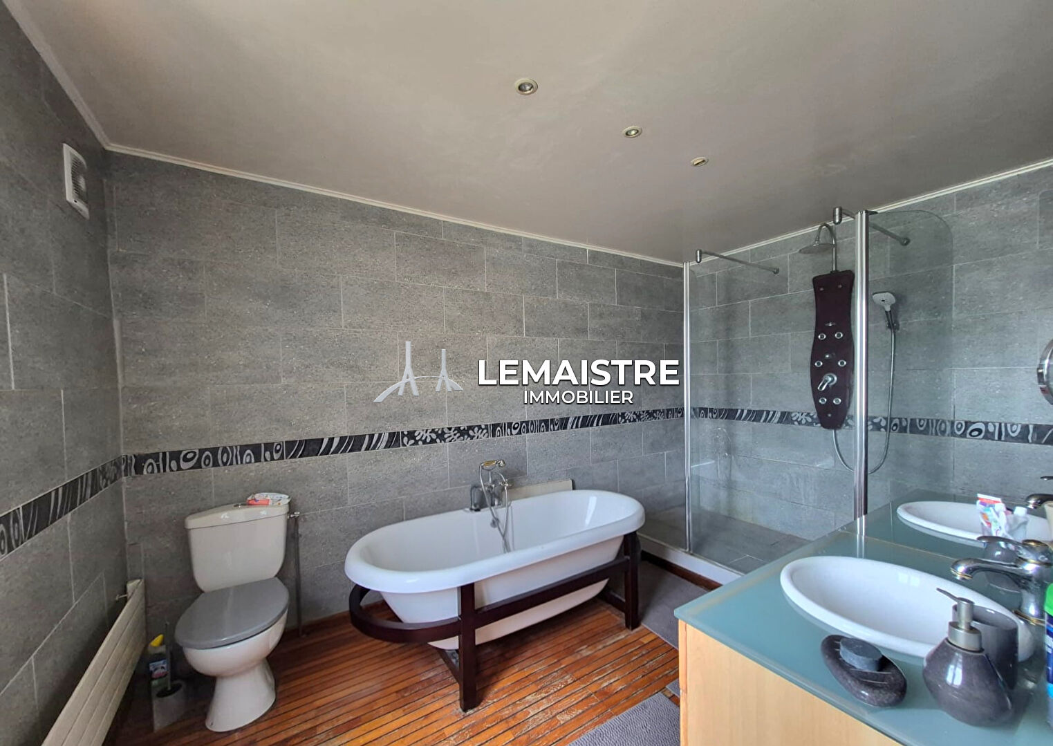 Au 1er étage, vous trouverez une grande chambre, un bureau (ou chambre d'appoint) et une vaste salle de bains avec WC.