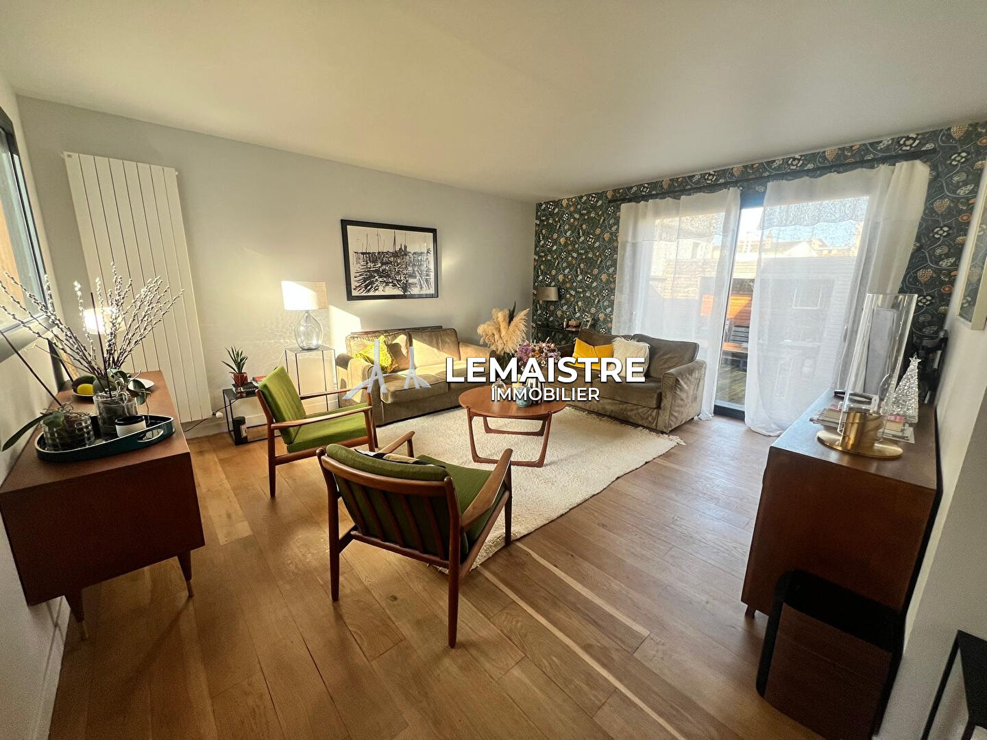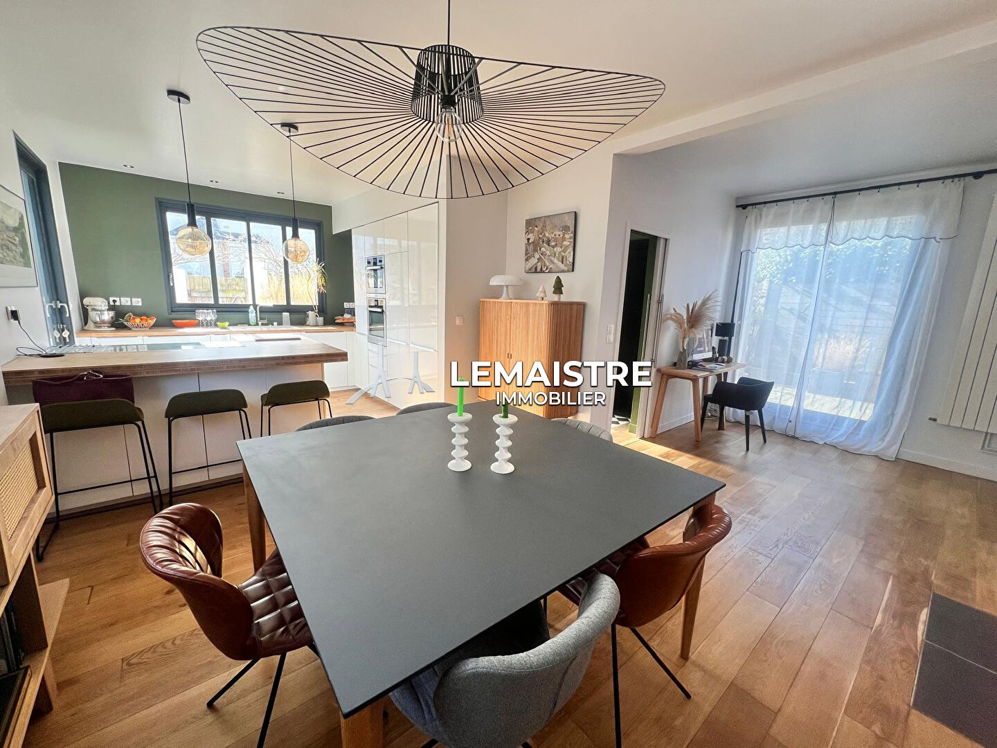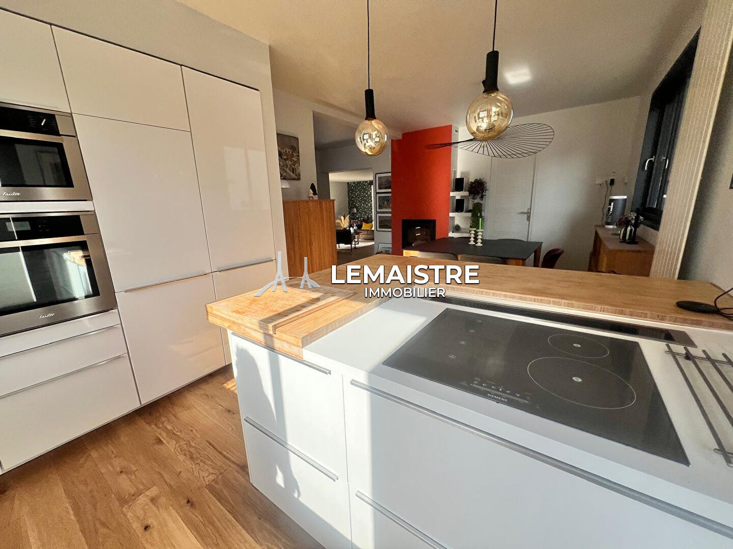 Elle propose une cuisine ouverte sur une superbe pièce de vie de 50m² avec poêle à bois, lumineuse et conviviale donnant directement accès à une TERRASSE exposée plein SUD et au JARDIN.