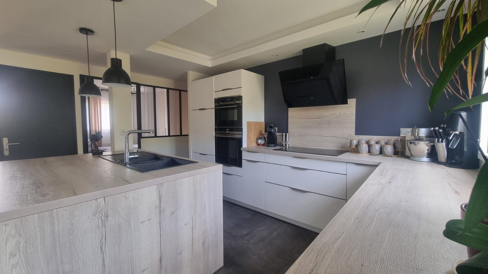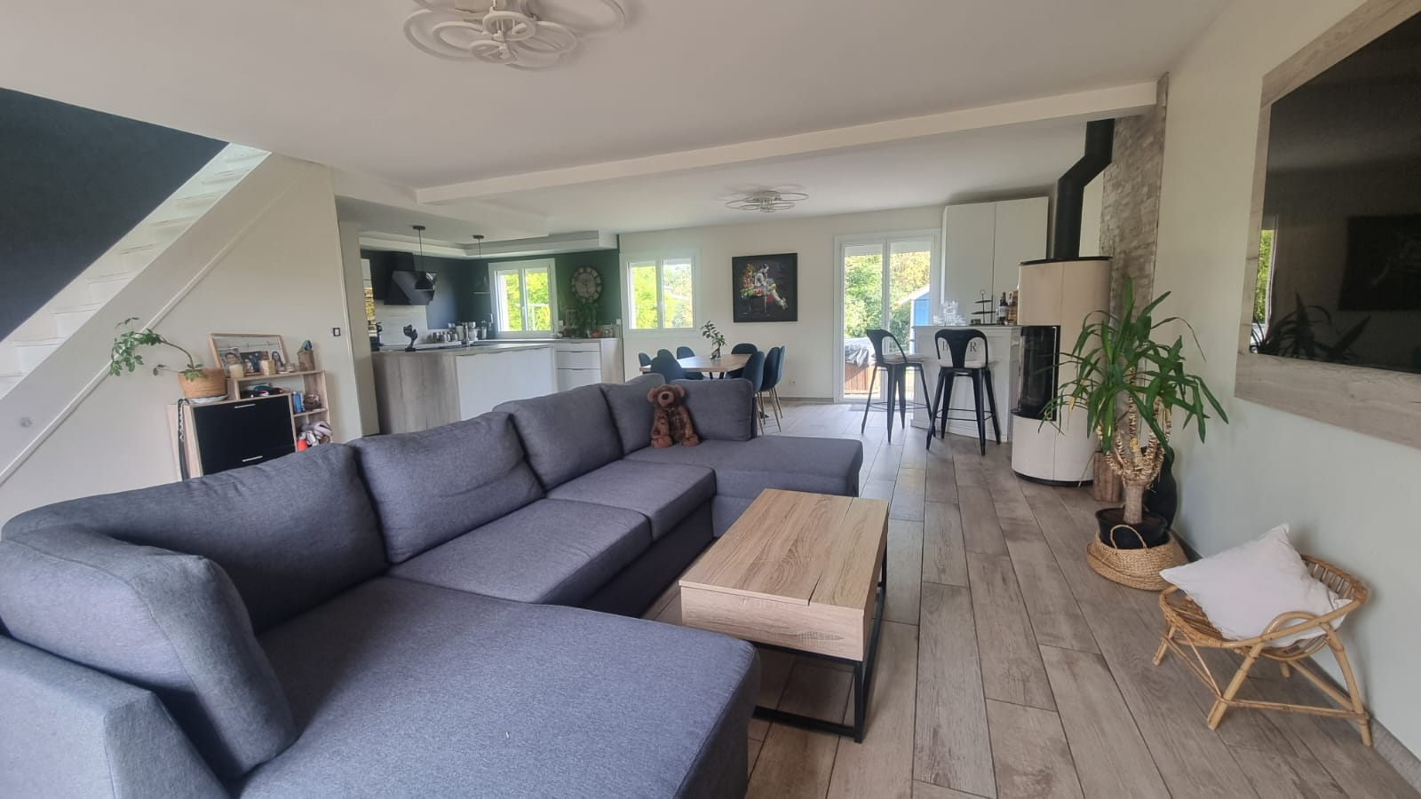 - Au rez-de-chaussée : entrée sur bel pièce de vie traversante avec poêle mixte bois/granulés, cuisine ouverte, aménagée et équipée, 2 chambres, salle d'eau, WC indépendant avec lave-mains.