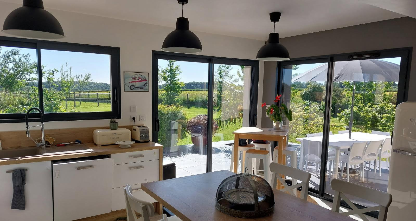 Les huisseries sont en alu et la maison est équipée d'une pompe à chaleur avec plancher chauffant et d'une alarme.
