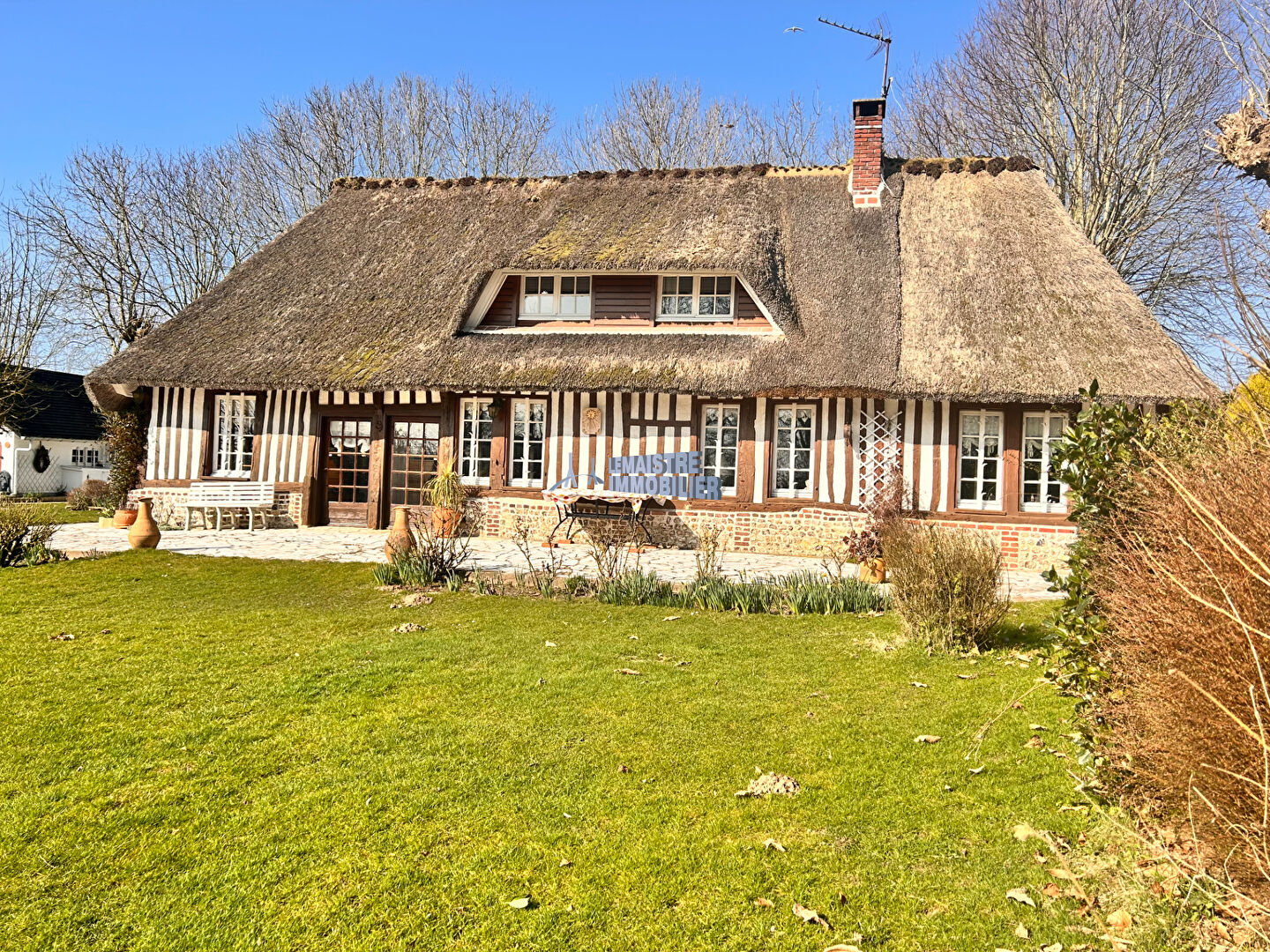 NOUVEAUTE CHARMANTE maison à colombages couverte en chaume avec VIE DE PLAIN PIED sur belle parcelle de prés de 2000m² proche CRIQUETOT L'ESNEVAL et ETRETAT Elle se compose au rez-de-chaussée d'une entrée, une cuisine aménagée équipée, un vaste salon avec CHEMINÉE, une salle à manger, une chambre avec salle de douche, un bureau, une salle de douche et un WC. Au 1er étage vous trouverez un grand palier desservant une chambre avec salle de douche et une seconde chambre avec dressing. Possibilité de transformer la salle a manger en une quatrième chambre. Ce bien dispose d'un joli jardin arboré avec terrasse, garage, carport et dépendance.
