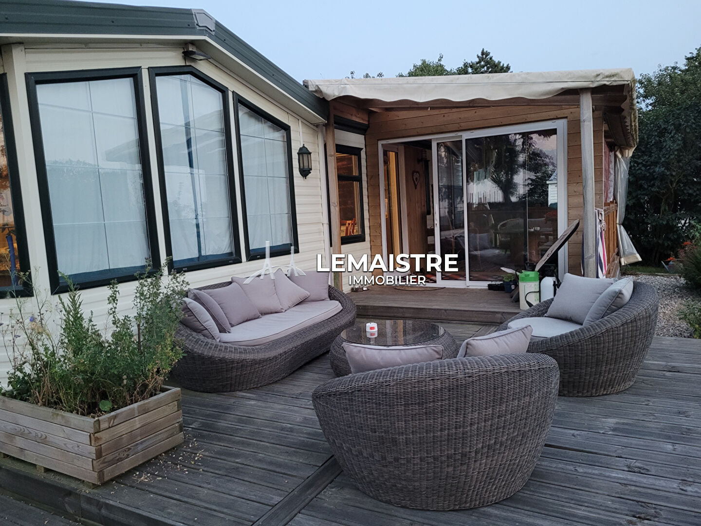* Mobil-home principal (env 39 m²) : pièce de vie, chambre, dressing, salle d'eau, wc, grande terrasse partiellement couverte.